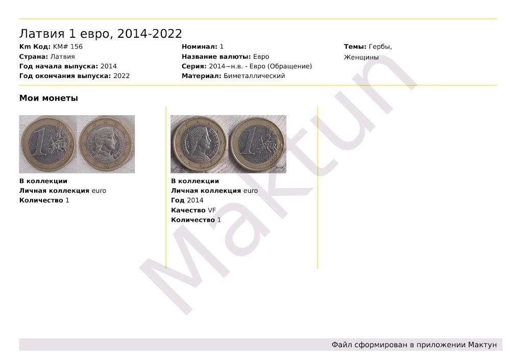 Экспорт вашей коллекции по различным условиям в удобные форматы, такие как PDF, XLS или CSV. Вы можете сохранить свои ценные сведения о монетах и банкнотах на своем устройстве или поделиться ими с друзьями и единомышленниками.